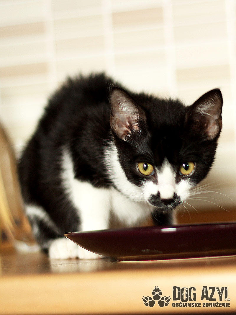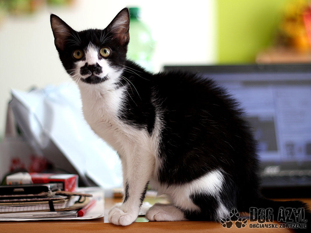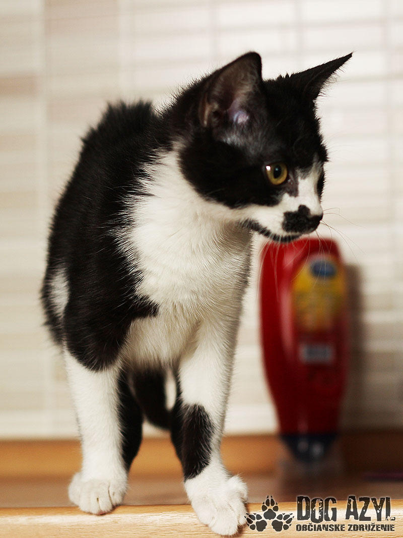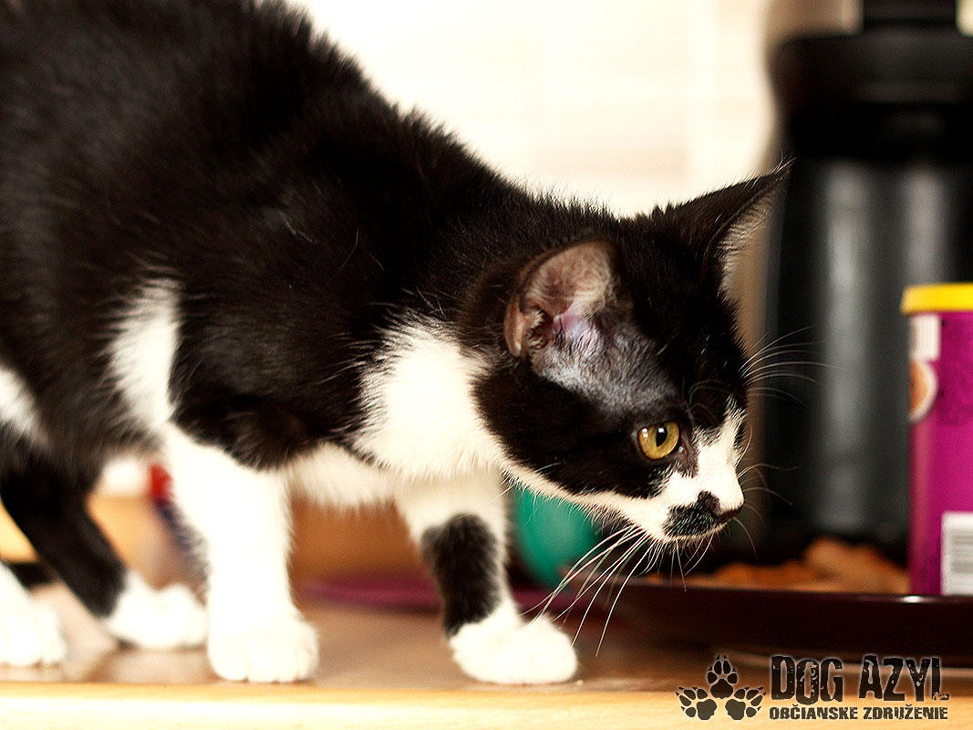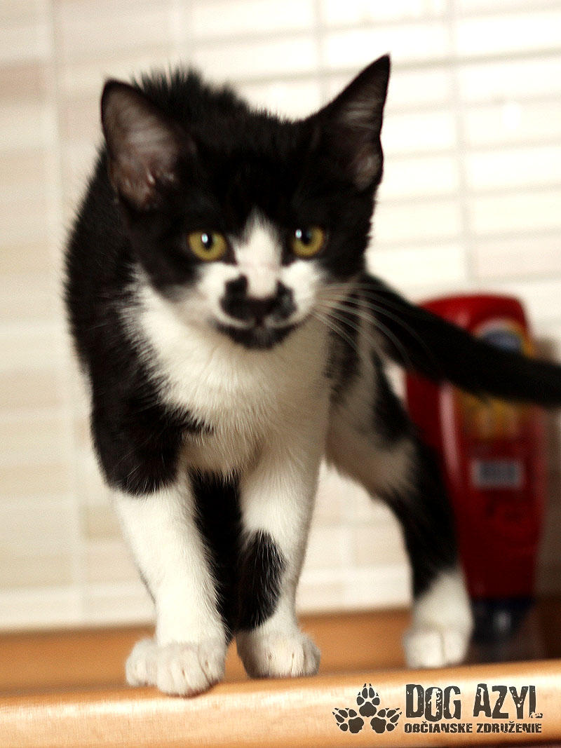 Nie, nemýlite sa, toto je naozaj mačiatko :) A nie hocijaké! Je to úplne prvé mačiatko v histórii Dog Azylu :) Mirtyl, narodená cca máj 2015, sa našla na ceste s útulku, asi 5 minút pred smrťou :( Dezorientovane pobehovala a schovávala sa v kukurici. Bola veľmi vyplašená, ale našťastie sa dala chytiť. Mačiatko bolo dehydrované, a veľmi hladné. Dnes je z nej však krásavica a hľadá si milujúci domov. Mirtyl je v dočaske, žije vo svorke šiestich psíkov. Štekať síce ešte nevie, ale povel "zostaň" už celkom pekne zvláda :) Je veľmi prítulná, mierumilovná, ale aj živá a zvedavá. Čo si človek neodloží, to je jej :) Rada vysedáva v okne a pozoruje dianie na ulici. Hračky ju veľmi nezaujímajú, stačí je obyčajný špagátik alebo palička a dokáže s ním bojovať celý deň :) Celé dni ani hlások nevydá, ale akonáhle zbadá misku a papaním, vie sa poriadne rozmňaukať :D Nie je vhodná ako vonkajšia mačička na dvor, ale výbeh do zabezpečeného dvora isto rada uvíta. Je to skôr klasický bytový gaučák :) Je 100%-ne čistotná, používa mačacie WC, a ešte nikdy netrafila vedľa :) Na svoju šancu čaká od júla 2015.