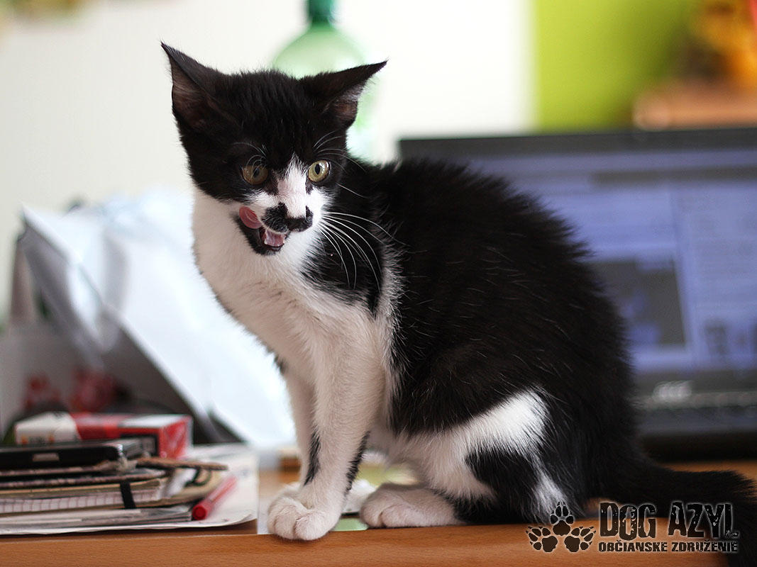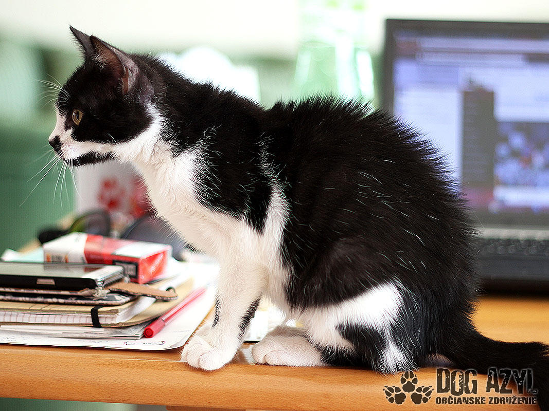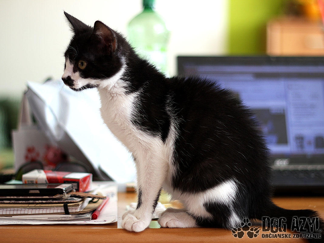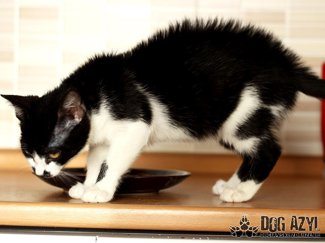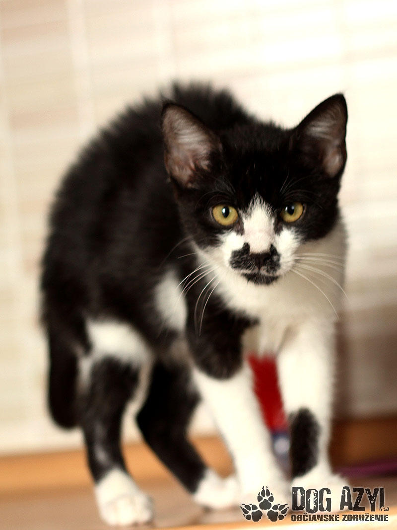 Nie, nemýlite sa, toto je naozaj mačiatko :) A nie hocijaké! Je to úplne prvé mačiatko v histórii Dog Azylu :) Mirtyl, narodená cca máj 2015, sa našla na ceste s útulku, asi 5 minút pred smrťou :( Dezorientovane pobehovala a schovávala sa v kukurici. Bola veľmi vyplašená, ale našťastie sa dala chytiť. Mačiatko bolo dehydrované, a veľmi hladné. Dnes je z nej však krásavica a hľadá si milujúci domov. Mirtyl je v dočaske, žije vo svorke šiestich psíkov. Štekať síce ešte nevie, ale povel "zostaň" už celkom pekne zvláda :) Je veľmi prítulná, mierumilovná, ale aj živá a zvedavá. Čo si človek neodloží, to je jej :) Rada vysedáva v okne a pozoruje dianie na ulici. Hračky ju veľmi nezaujímajú, stačí je obyčajný špagátik alebo palička a dokáže s ním bojovať celý deň :) Celé dni ani hlások nevydá, ale akonáhle zbadá misku a papaním, vie sa poriadne rozmňaukať :D Nie je vhodná ako vonkajšia mačička na dvor, ale výbeh do zabezpečeného dvora isto rada uvíta. Je to skôr klasický bytový gaučák :) Je 100%-ne čistotná, používa mačacie WC, a ešte nikdy netrafila vedľa :) Na svoju šancu čaká od júla 2015.