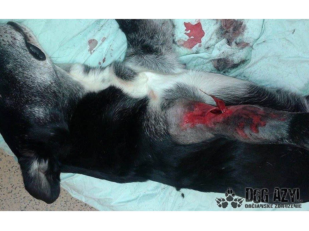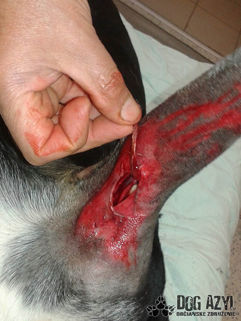 11.9.2015 sme obdržali telefonát od pána, čo býva pri útulku, že jednému psovi sa vyšmykla packa cez mrežu a druhý mu ju trhá :( Hneď sme tam uketali a našli nášho Chilliho celého od krvi, mal veľmi škaredo dotrhanú nohu a packu. Leteli sme na veterinu, našťastie nás pán doktor prijal pohotovostne, aj keď klinika bola zatvorená...