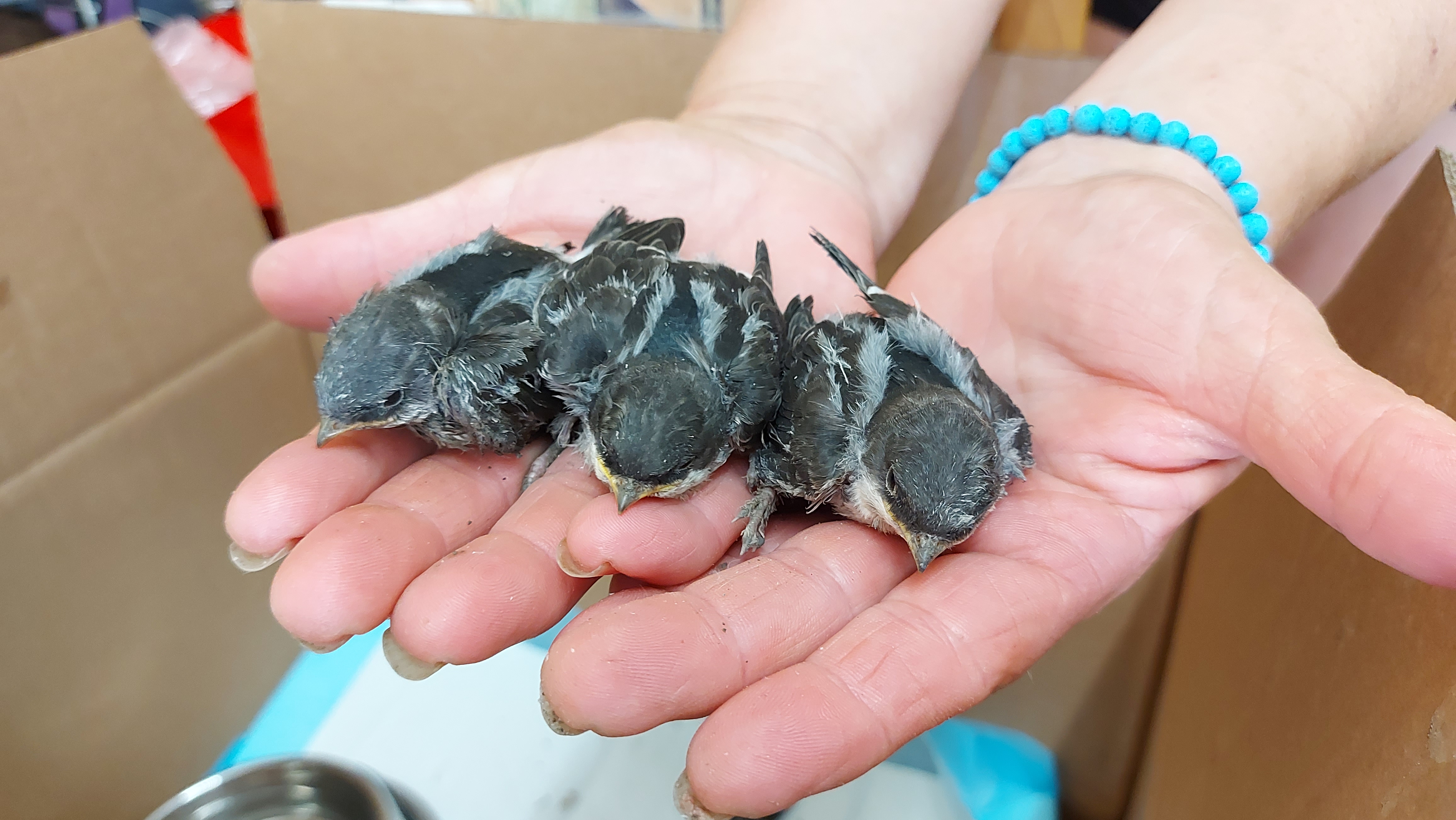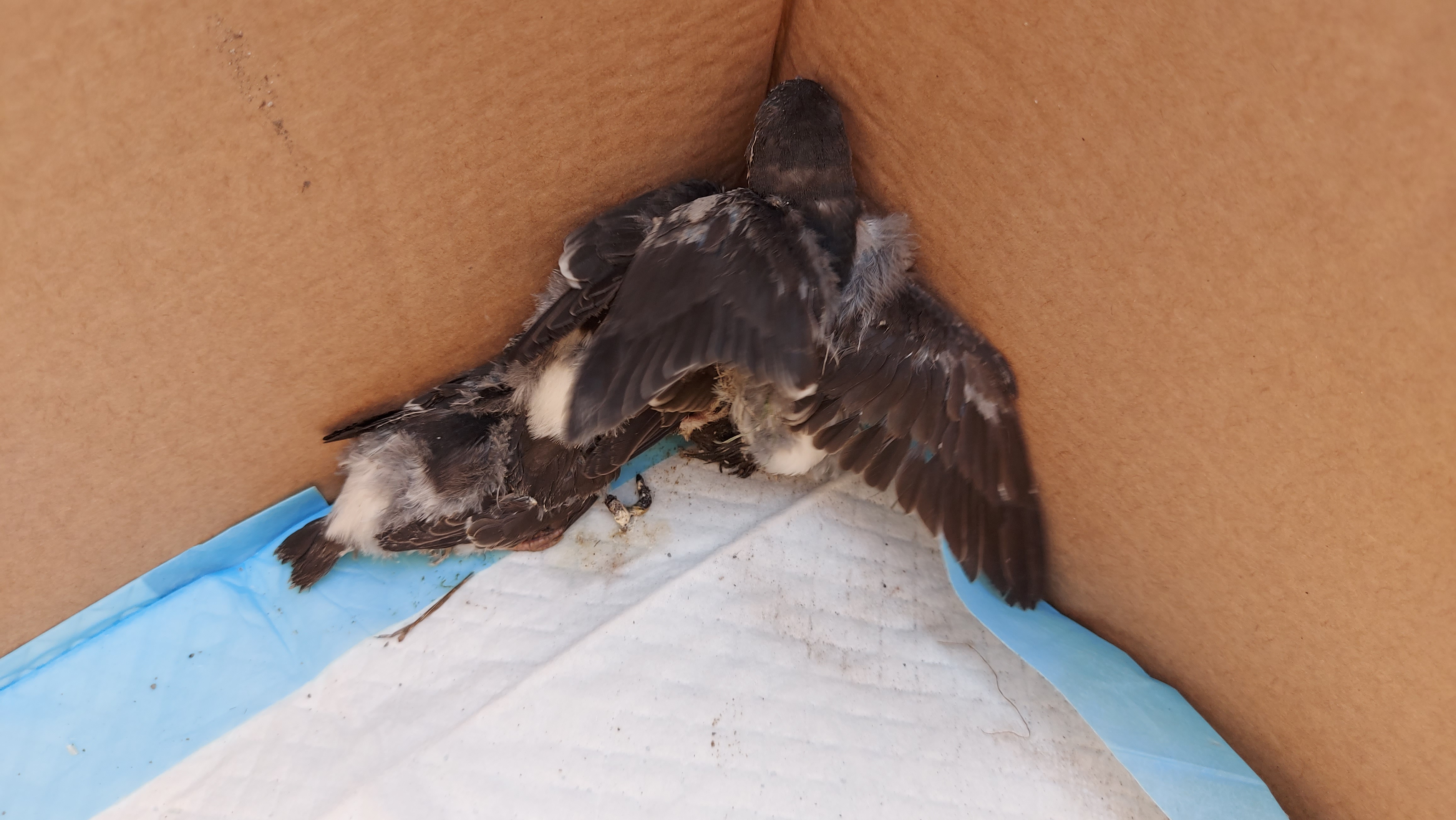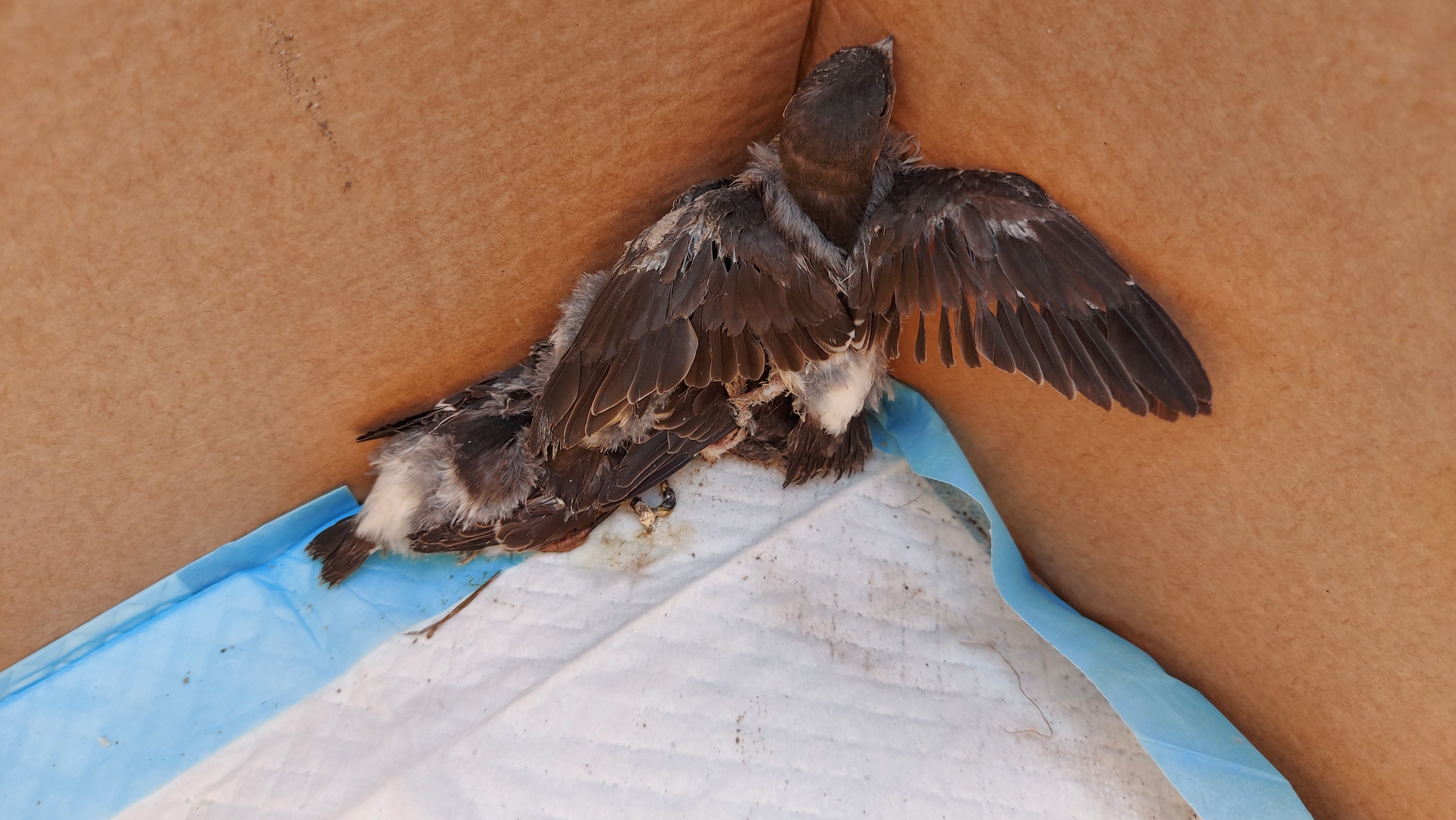 Osadníci vybrali (asi) lastovičie hniezdo a drobcov nám prehodili vo vedre do útulku!!!!! Boli medzi nimi az holé jedince, asi iné hniezdo. Tie už žiaľ.. :( 4 operené mláďatá ešte žijú, ale OKAMŽITE POTREBUJEME POMOC!!!!! Nehanbime sa priznať, že o vtáčikoch vôbec nič nevieme, a máme obavy, že im našou pomocou ublížime!!!!!